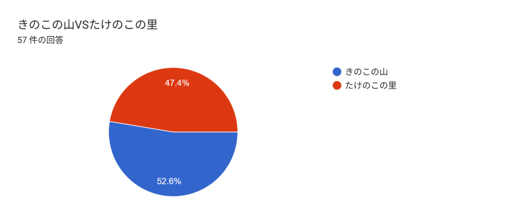 たけのこ派の私としては非常に納得がいかない結果ですが、数値として表れてしまっているので今回は負けを認めてあげることにします。きっと、たまたま、きのこ派の方が多かったんでしょうね!たまたま。