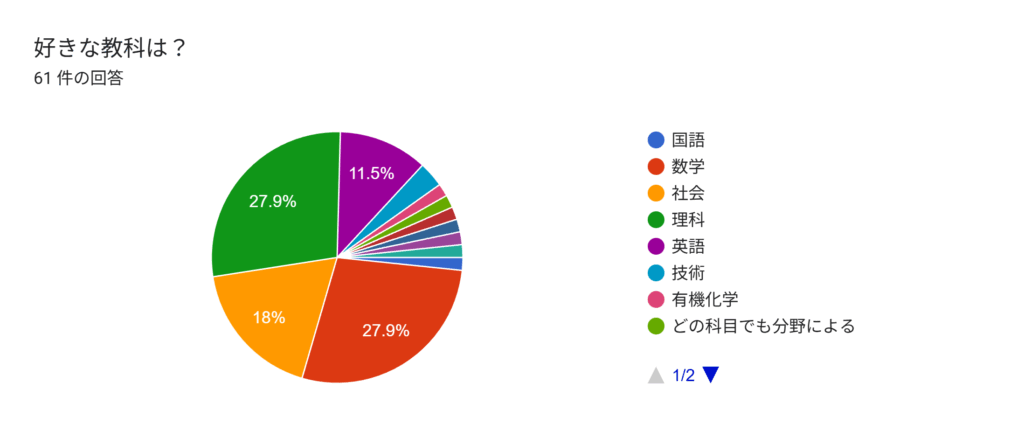 電技研の部員なので理系科目が好きな部員が多いのでは予想していましたが、意外と社会が好きな部員が多かったのが印象的でした。中には有機化学や物理など特定の分野が好きという意見もありました。