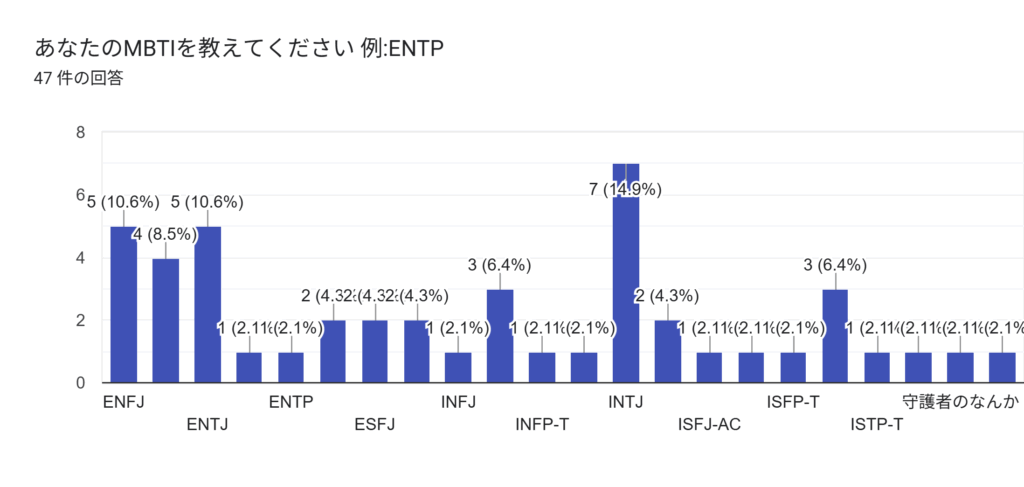 INTJ(建築家)が7人と最多になりました。INTJは論理的な思考力を持つタイプで、問題解決能力に長けているといわれています。また、INTJは全人口の2%ほどしかいない珍しいMBTIだそうです。